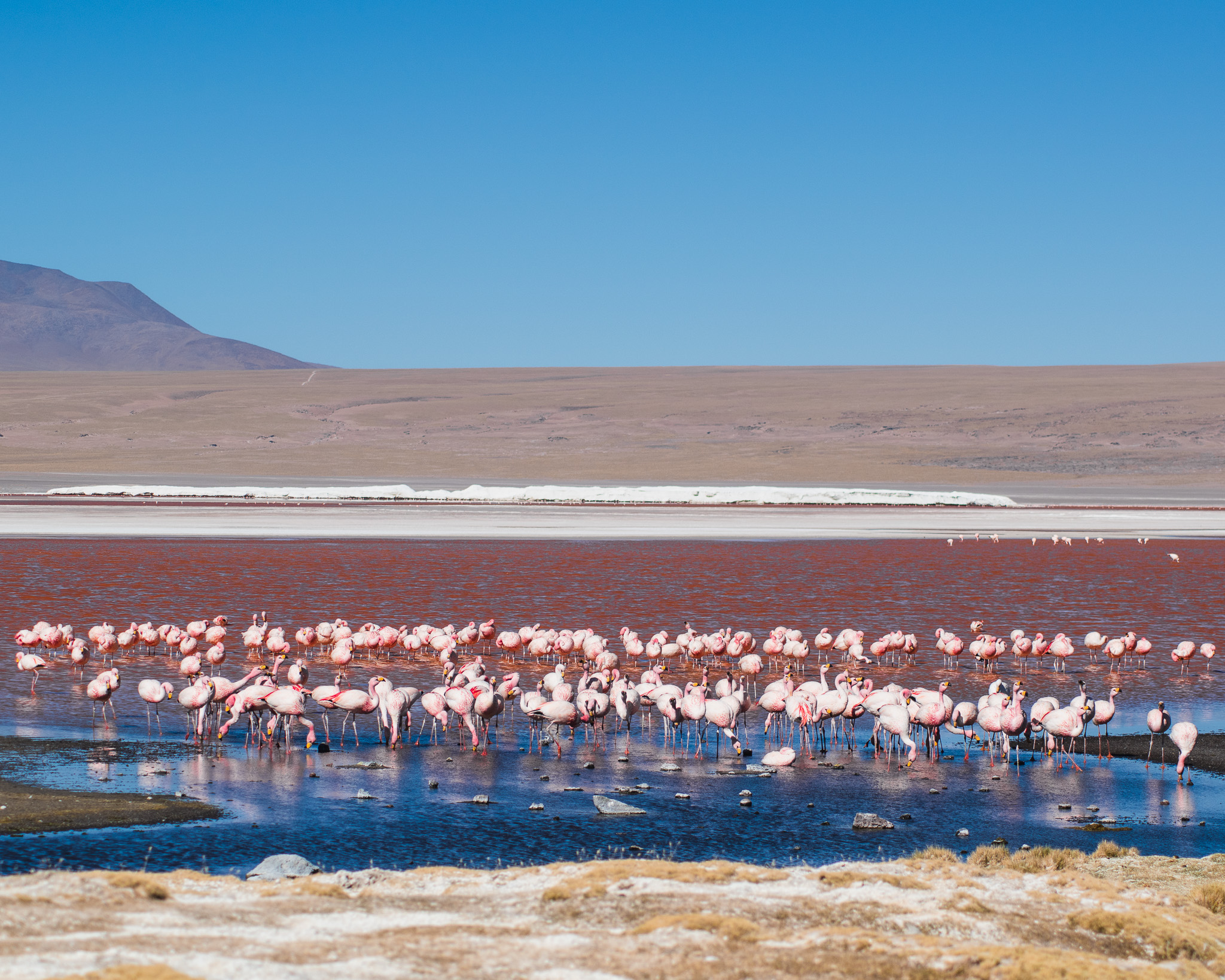 El día 5 partí hacia la Laguna Colorada, pasando por el “Árbol de Piedra”, una formación esculpida por el viento. El camino descendía, pero la arena me obligó a empujar la bicicleta durante dos horas para recorrer 15 km. Llegué a la entrada de la Reserva Nacional de Fauna Andina Eduardo Avaroa, dónde estaba la Laguna Colorada. Aca viven cientos de flamencos que añadían belleza al paisaje rojizo. Mi destino ese día era el pequeño poblado de Huayajara. Tras un día agotador, llegué al hostal cubierto de tierra, pero con la recompensa de un baño caliente y una comida.