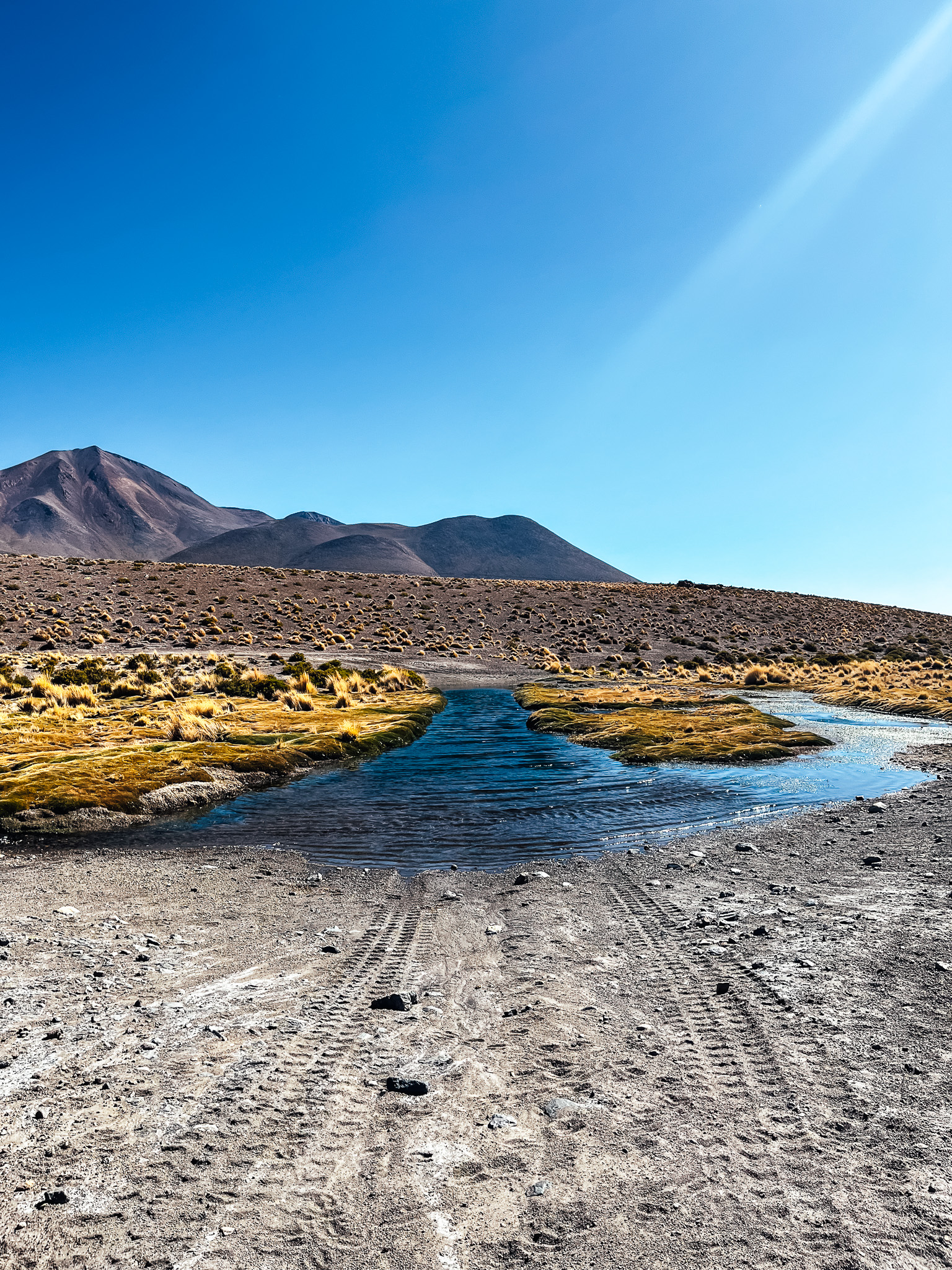 Al amanecer, presencié los géiseres en su mayor actividad, mi sensación era de estar en Marte, aislado del mundo y sin señal hace días. Era absorbente el lugar donde había logrado llegar. El camino ese día fue un premio: poco viento y una larga bajada hasta las Termas de Polques, donde un baño termal me devolvió la energía.