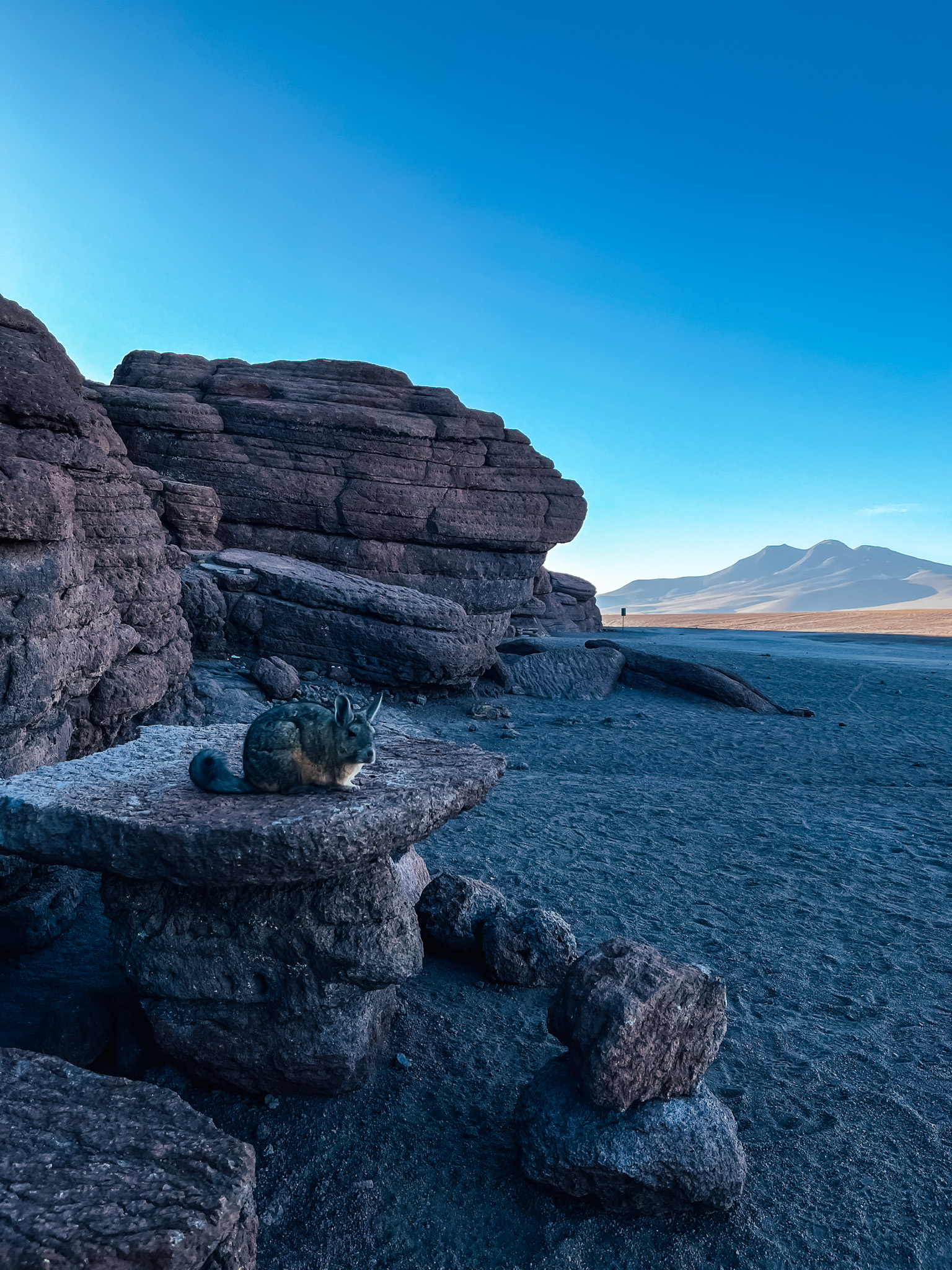 La última hora de luz fue una lucha contra el camino y el viento, pero finalmente llegué y compartí la cena con curiosas vizcachas sobre una mesa de piedra en la soledad del desierto.