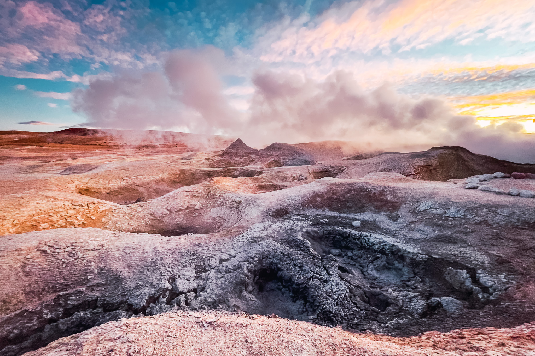 Después de un descanso reparador, salí con dirección a los Géiseres Sol de Mañana. Aunque era un tramo corto, debía subir todo lo que bajé el día anterior. Con la bicicleta de 60 kg, enfrenté una pendiente del 20% a más de 4000 msnm. Me tomó dos horas llegar al altiplano, donde el paisaje desértico y la soledad eran absolutos. Después de 25 km, arribé a los géiseres, ubicados a 4950 msnm, con fumarolas activas y un viento de más de 20 km/h. Busqué un lugar resguardado del viento para poder acampar y disfrutar los géiser que se encontraban a menos de 100 metros de mí.